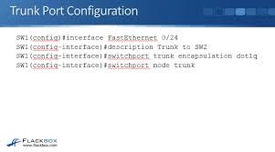 Configuring a Cisco trunk port enables a single physical interface to carry traffic for multiple VLANs between switches using 802.1Q encapsulation. Essential commands involve entering interface configuration mode, setting encapsulation to dot1q (if needed), and changing the port mode to trunk. Basic Trunk Configuration Commands text Switch# configure terminalSwitch(config)# interfaceSwitch(config-if)# switchport trunk encapsulation dot1q // Required…